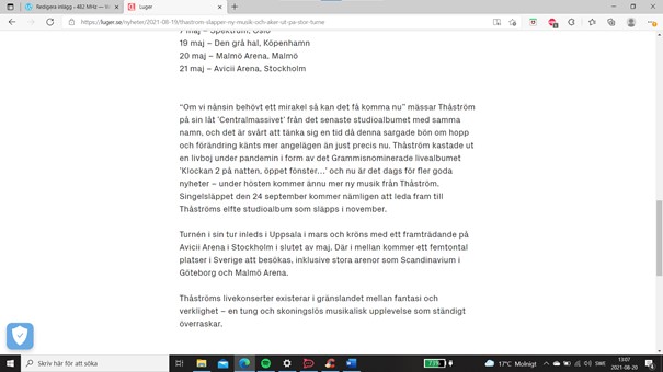 Idag utannonserades det att Thåström – som bekant en av 482 MHz:s kanske två största husgudar – ska släppa nytt material. Singel i september, album i november, och turné i vår. Glädjen var som ni förstår ett faktum – tills dess att jag läste bokningsbolaget Lugers ”presstext”. Sekunder in i läsningen insåg jag att stora delar av den mycket korta texten var plageriad. Texten som plagierats? Min recension av Thåströms liveplatta Klockan 2 på natten öppet fönster, som släpptes i maj i fjol. Nu är du paranoid och självupptagen, Lövgren, tänker ni förstås nu. Men sakta i backarna, säger jag. Jag har förstås täckning för vad jag påstår. Här är en screenshot från Lugers text:
